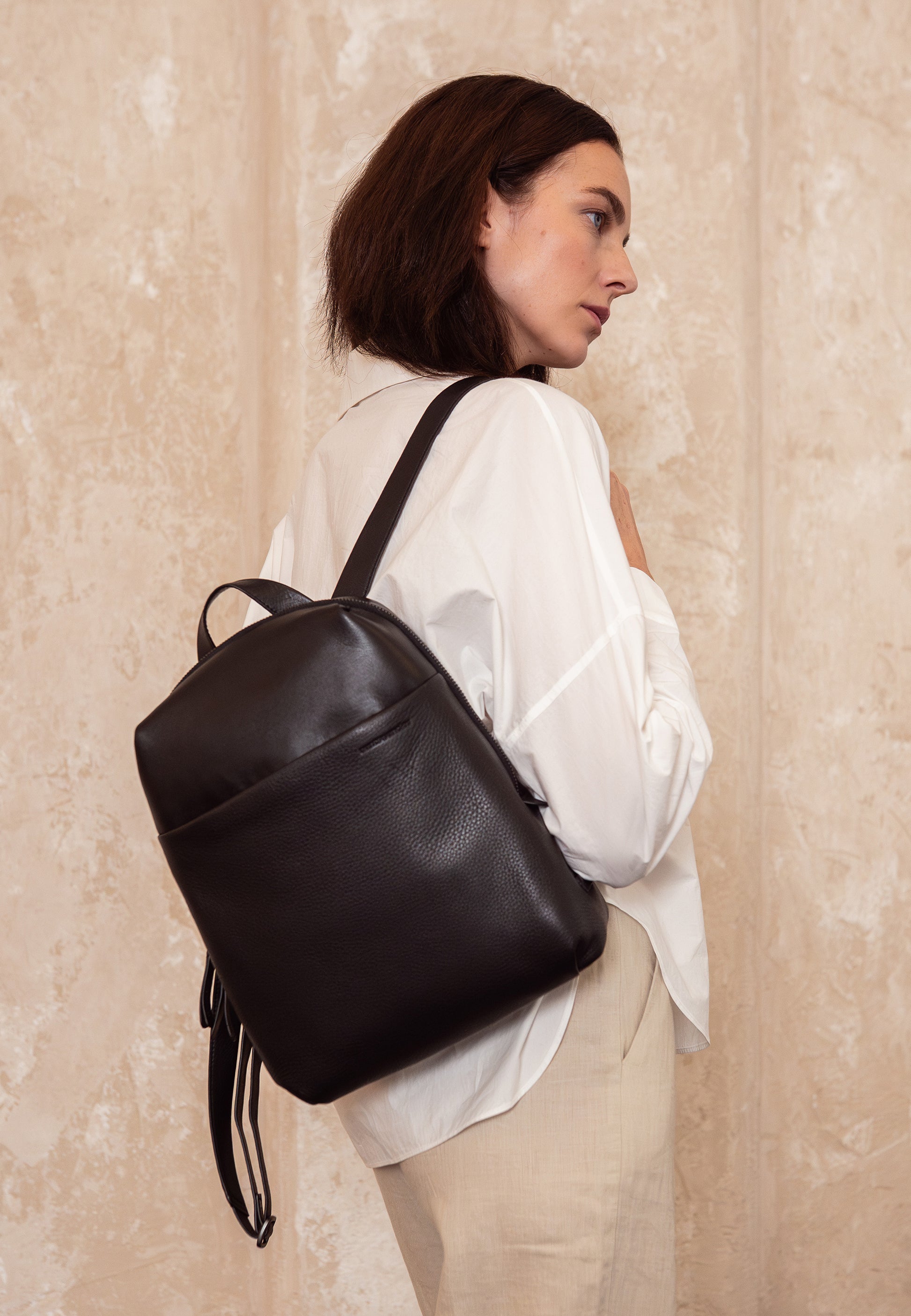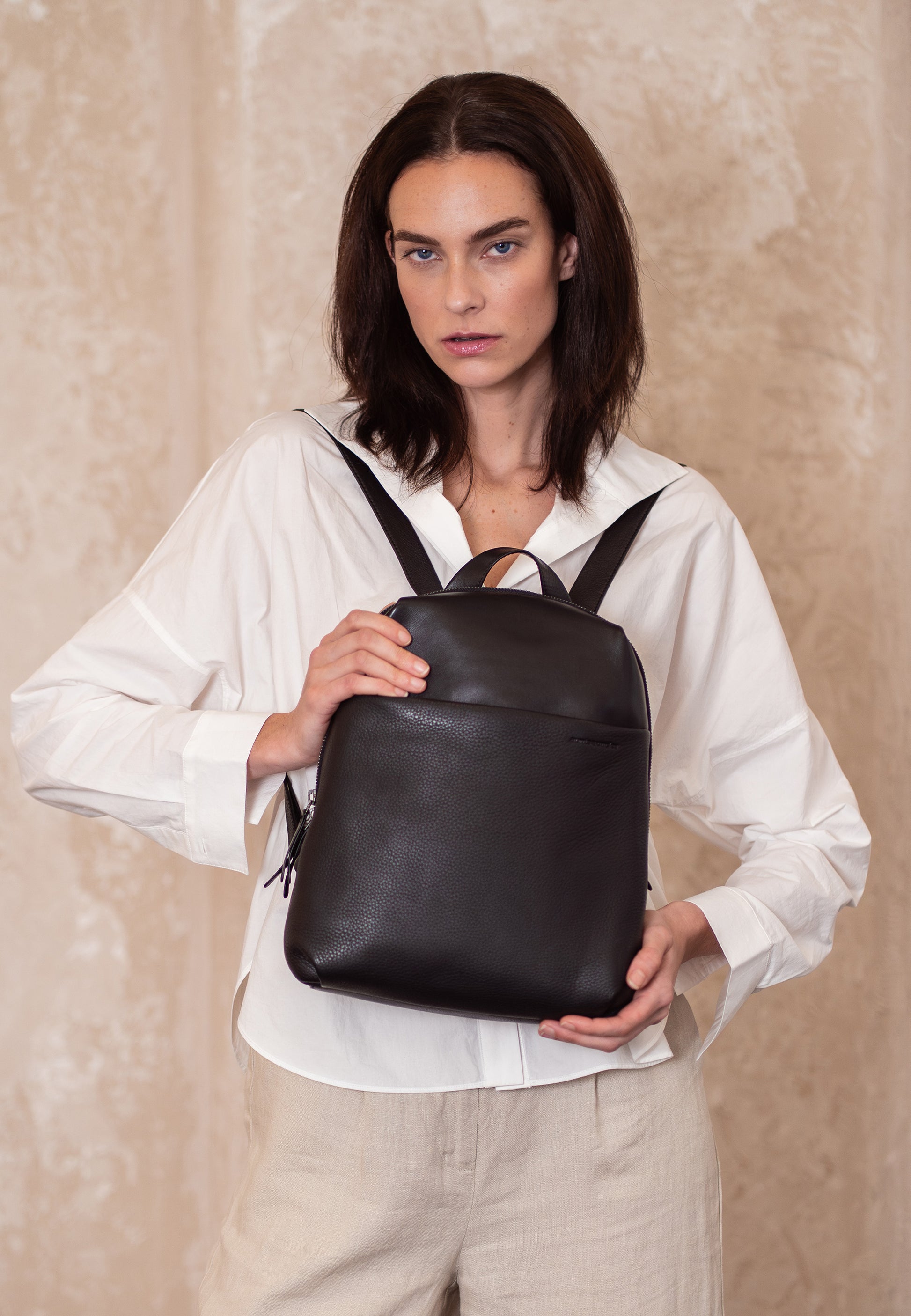 Charm är en rymlig och elegant ryggsäck där funktion möter sofistikerad design. Den praktiska dragkedjan med två löpare som löper runt väskan gör det enkelt att öppna och komma åt innehållet, medan kombinationen av slätt och lätt strukturerat läder ger modellen en lyxig och modern känsla.