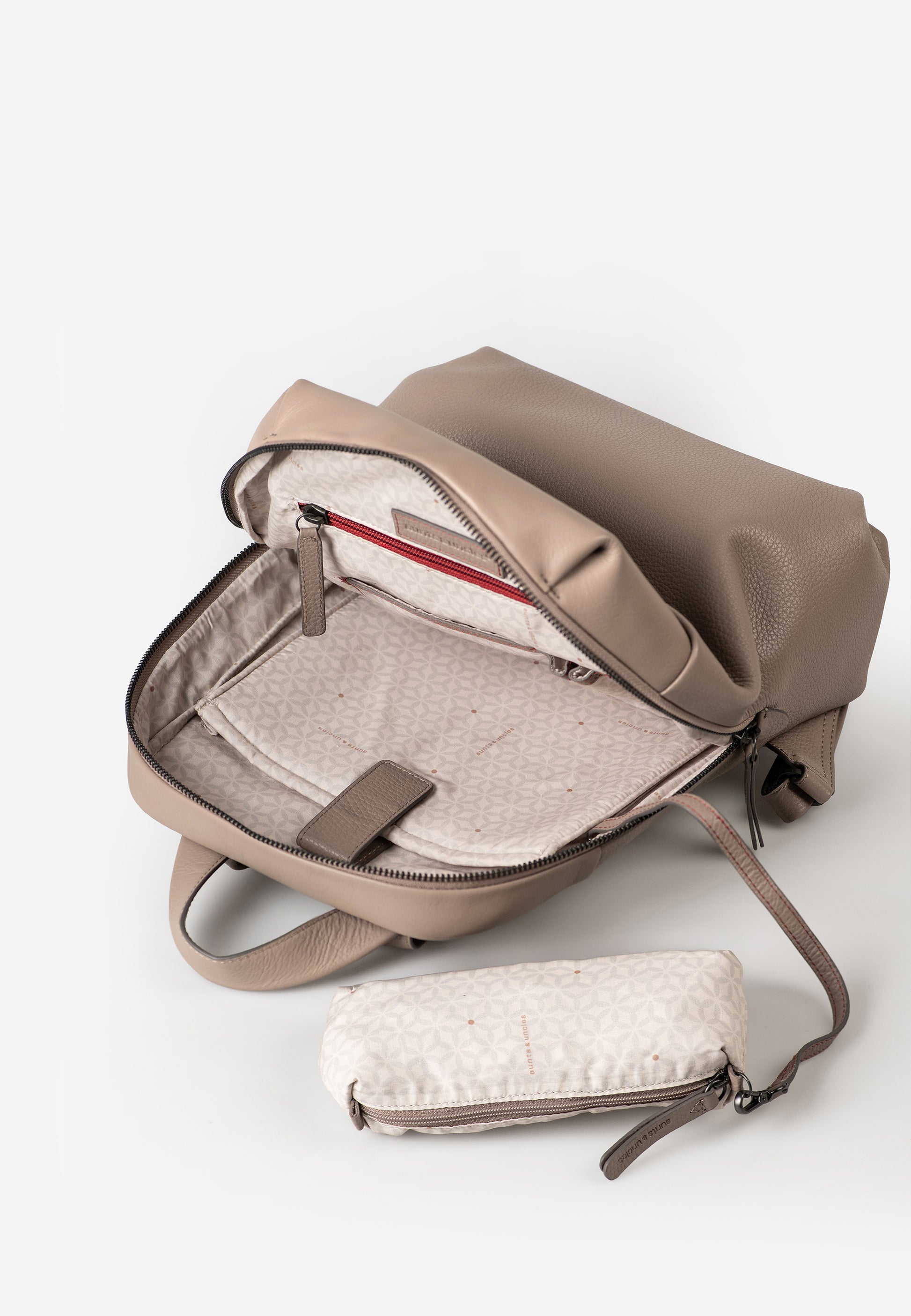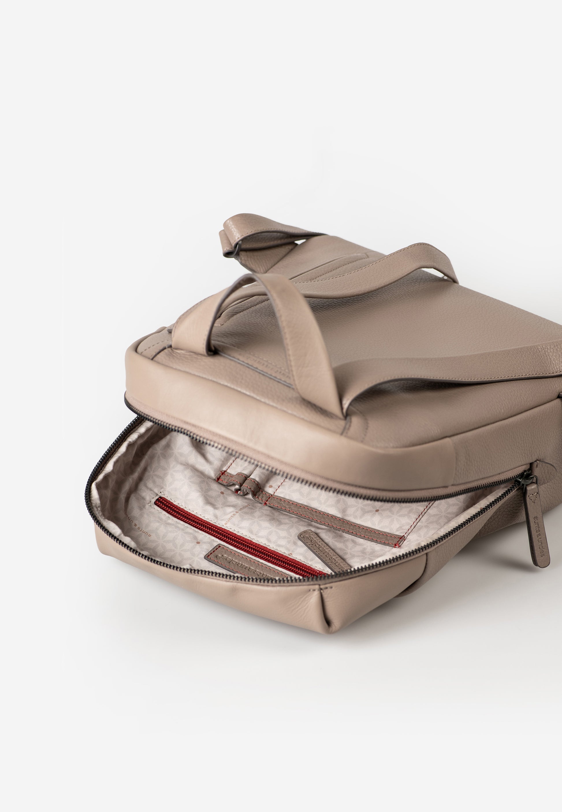 Charm är en rymlig och elegant ryggsäck där funktion möter sofistikerad design. Den praktiska dragkedjan med två löpare som löper runt väskan gör det enkelt att öppna och komma åt innehållet, medan kombinationen av slätt och lätt strukturerat läder ger modellen en lyxig och modern känsla.