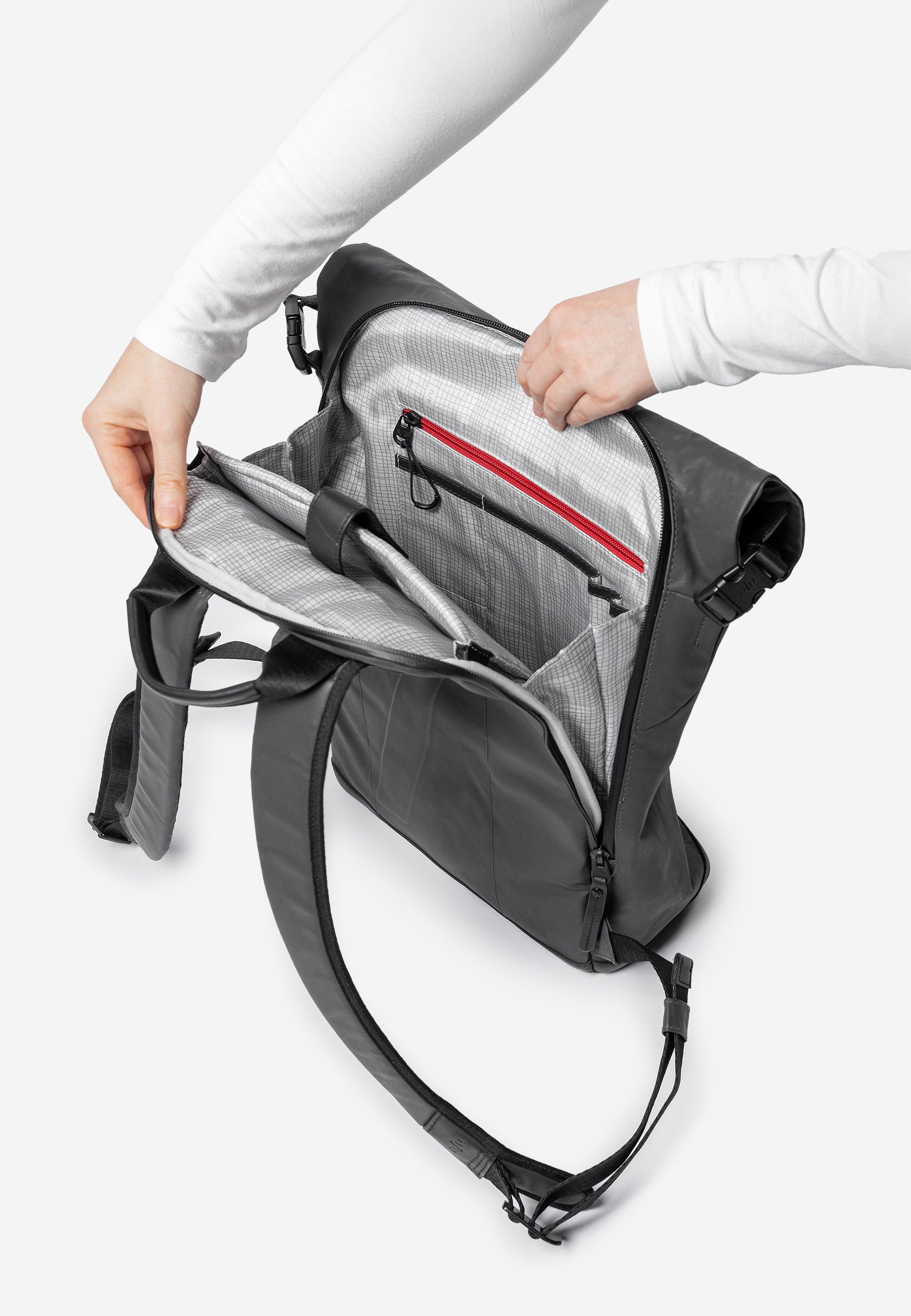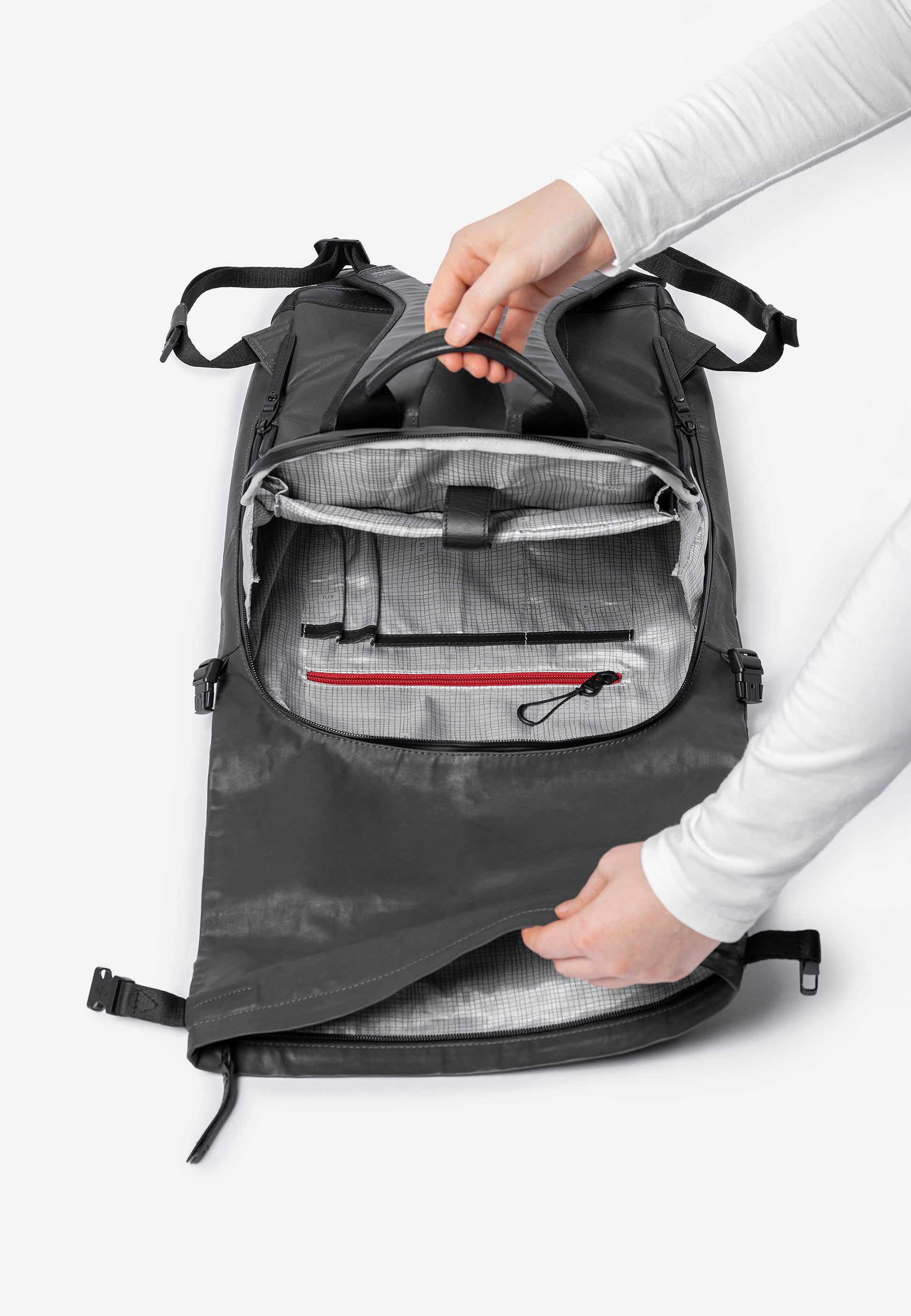 Fukui är den större versionen av Tokio – tillverkad i sidenmatt, belagd bomullscanvas med vattentäta dragkedjor och gott om utrymme för en laptop upp till 15 tum. Den sportiga ryggsäcken har dessutom en extra stor dragkedjeöppning på baksidan för enkel och snabb åtkomst till huvudfacket.