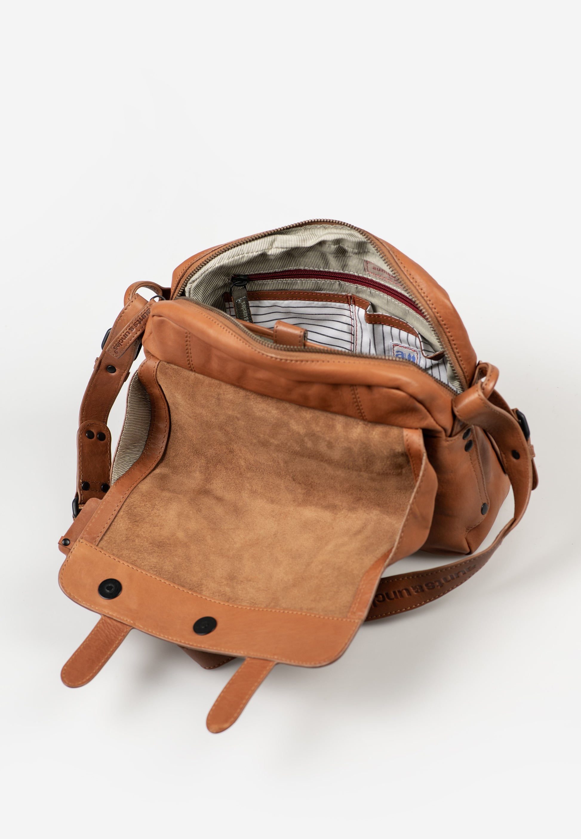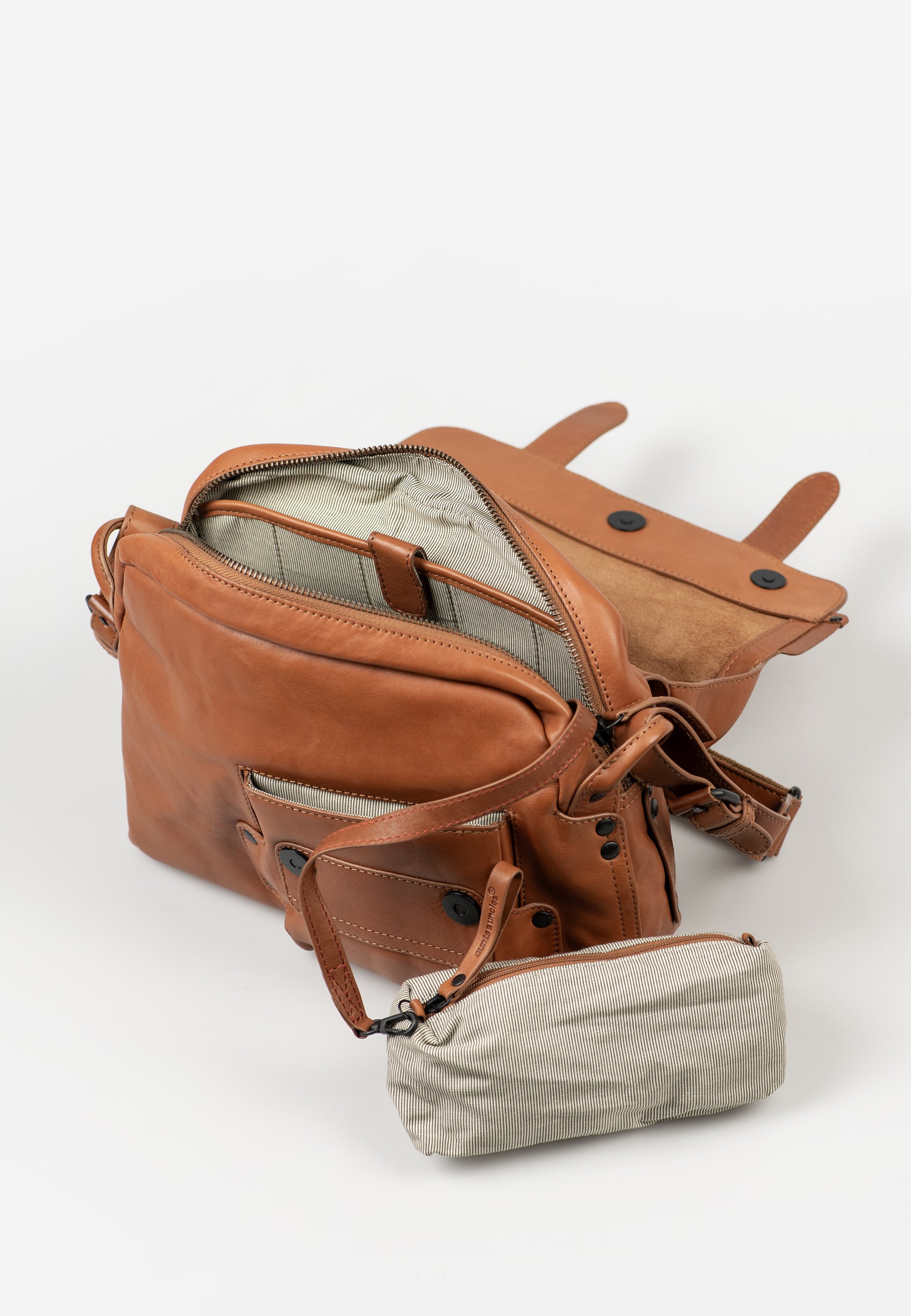 Miss Applepie förgyller vardagen med perfekt organisation och stor omsorg om detaljerna. Den klassiska postbag-modellen är tillverkad i högt vegetabiliskt garvat premiumläder och erbjuder gott om smarta förvaringslösningar, en vadderad axelrem och ett praktiskt nyckelband. För att småsaker inte ska komma bort ingår dessutom ett litet, avtagbart extraetui.